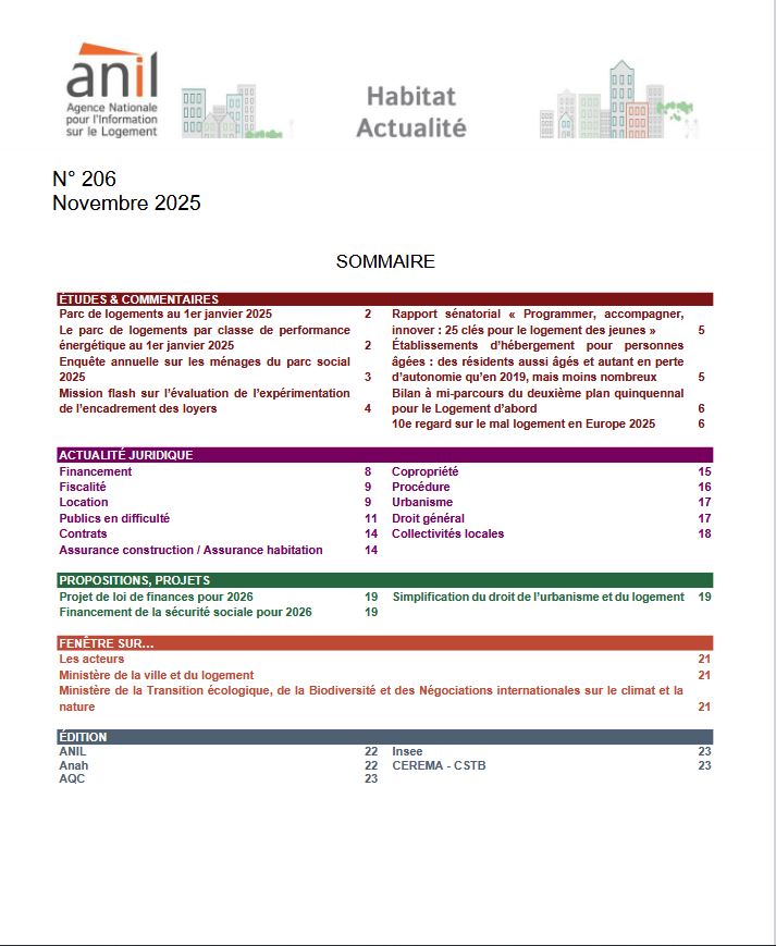 Ce bulletin bimestriel fait le point sur l’actualité du logement : études, propositions, projet et surtout l’évolution de la règlementation et de la jurisprudence dans tous les domaines intéressant le logement : financement du logement, droit de la location, fiscalité, urbanisme, contrats, copropriété, assurances, collectivités locales, publics en difficultés…